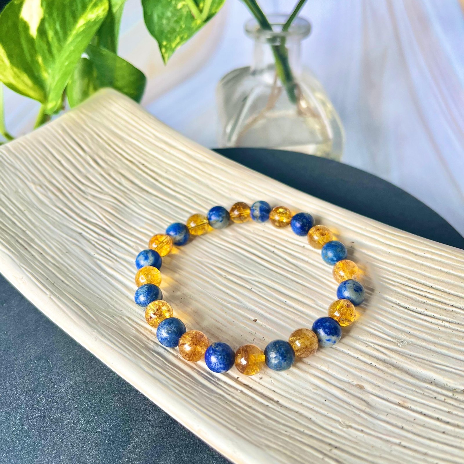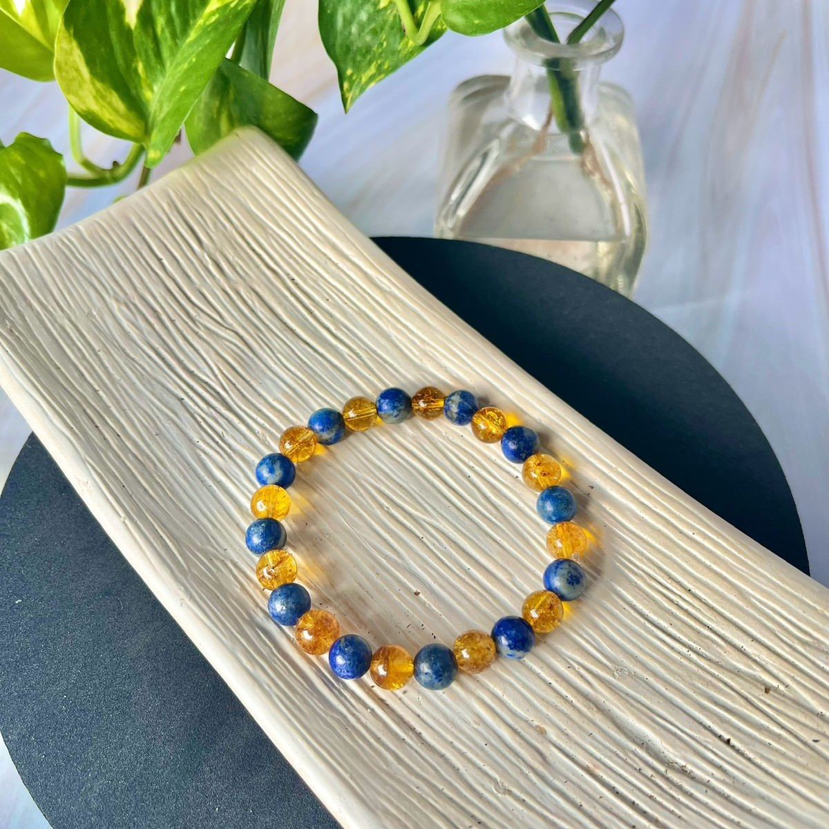 | Ideal For : | The Citrine and Lapis Lazuli bracelet seamlessly blends these gemstones, creating a harmonious fusion that aligns with abundance and wisdom. This bracelet serves as a powerful tool for those seeking material prosperity and spiritual growth, enveloping the wearer in positive vibes from Citrine for optimism. |